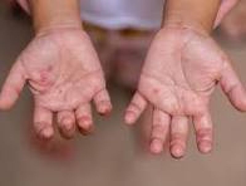 wysypkę w lokalizacji dłoni, stóp, jamy ustnej bez towarzyszącego świądu.