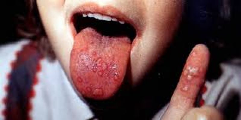 Po okresie gorączki, który trwa około 24–48 godzin, pojawiają się pierwsze zmiany pęcherzykowe w obrębie jamy ustnej – lokalizują się głównie na błonie śluzowej policzków, języku oraz łukach podniebiennych. Początkowo przyjmują postać rumieniowych plamek.